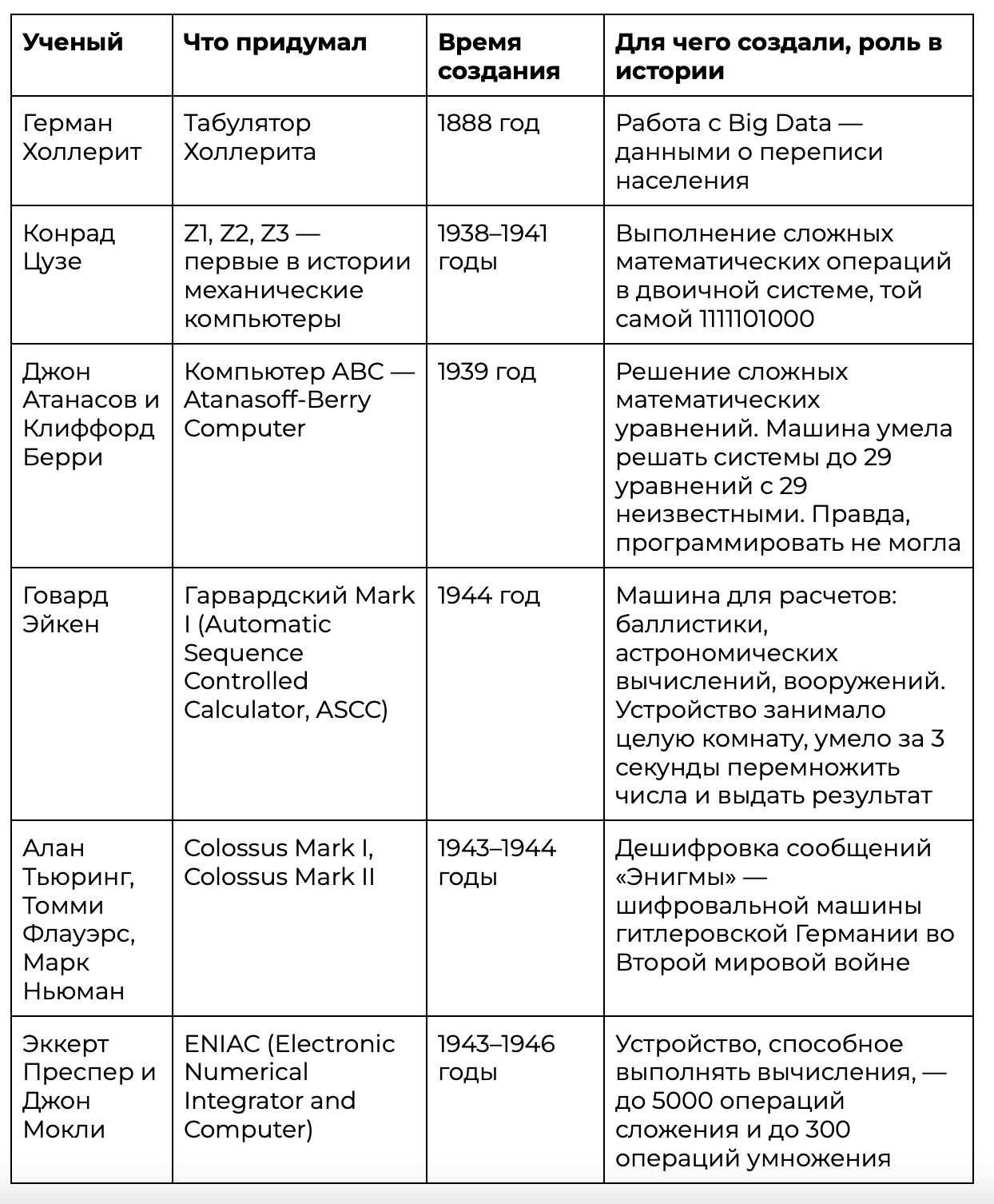 На самом деле были и другие ученые, которые внесли вклад в развитие ПК и вычислительных машин. Например, упомянутый выше ENIAC не сохранял программы в памяти. Чтобы запрограммировать его, ученые должны были каждый раз заново соединять кабели в нужной последовательности. Из-за этого процесс программирования занимал недели (а иногда и месяцы).